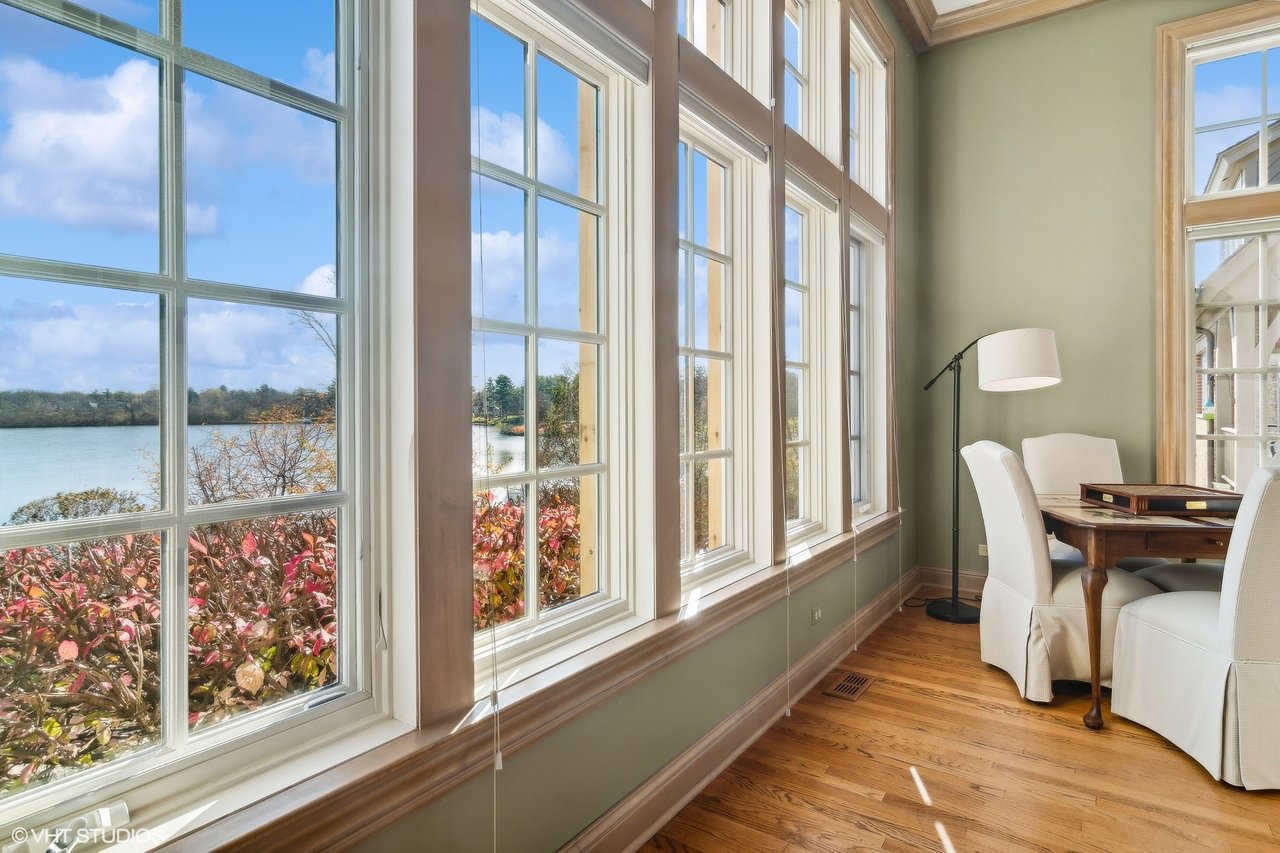 Perched on over five acres of lushly landscaped grounds with 400 feet of private shoreline, this stunning French Country estate offers unparalleled serenity on Barrington Hill's exclusive Hawley Lake. Perfectly blending refined luxury with inviting comfort, this property is an idyllic retreat, featuring a stately finely appointed brick home with breathtaking lake views, a resort-style pool, and a fully equipped outdoor kitchen. The meticulously maintained grounds showcase towering mature trees, rolling lawns, and a wealth of unique amenities, including two outbuildings: a two-stall barn with a separate area for chickens, and a charming historic original home, brimming with potential as a guesthouse, art studio, or private office. Inside, the home's timeless design and craftsmanship shine through. Soaring floor-to-ceiling windows bathe the spaces in natural light, highlighting intricate custom millwork throughout. The grand formal living room and two-story great room offer perfect settings for elegant gatherings, while the spacious chef's kitchen-with an adjoining hearth room and formal dining area-exudes warmth and functionality. The main-floor primary suite is a haven of luxury, complete with a private deck overlooking the lake and an inspiring library. An inspiring two story atrium leads to the second floor. The thoughtful layout features two ensuite bedrooms on one wing, two additional bedrooms sharing a full bath, a versatile loft playroom with built in bookshelves, and a 700-square-foot unfinished attic next to the separate back staircase. Designed for seamless indoor-outdoor living, the home includes a three-season screened porch ideal for alfresco dining or simply soaking in the tranquil views. The walkout lower level expands the possibilities, offering a light-filled family room, game room, wet bar (convertible to a second kitchen), dining area, gym, and a pool/playroom opening to the estate's spectacular outdoor spaces. The custom-designed pool, reminiscent of a boutique luxury resort, is framed by elegant stone hardscaping and complemented by a covered outdoor kitchen with a grill, refrigerator, and bar-perfect for entertaining or unwinding in style. Nestled at the end of a private cul-de-sac, this remarkable estate enjoys direct access to the spring-fed Hawley Lake, renowned for fishing, paddleboarding, pontoon boating, swimming, and wildlife sightings. Your private pier and beach offer endless opportunities to savor the natural beauty and breathtaking sunrises. The estate also includes a three-car attached garage and a circular driveway, ensuring ample space for guests. Located just minutes from Barrington's quaint village center, with its boutique shopping, five-star dining, award-winning schools, and convenient access to the Metra train, O'Hare Airport, and downtown Chicago, this property offers the perfect balance of seclusion and accessibility. A masterpiece of luxury and tranquility, this estate is a once-in-a-lifetime offering for those seeking an exceptional waterfront lifestyle.
